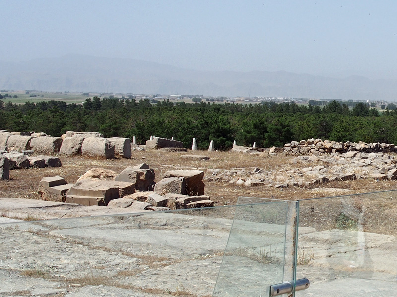 ⑮アルタクセルクセス3世の墓より眺めたクセルクセス1世宮殿、背後の低い土地に⑤H宮殿の牛の角形胸壁が見えている。