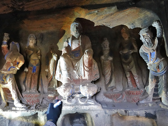 仏七尊像で、後世の補色で妙に鮮やか。現地ガイドの丁さんによると、両端の金剛力士像は、清時代に道教の門神に変えられたのだとか。