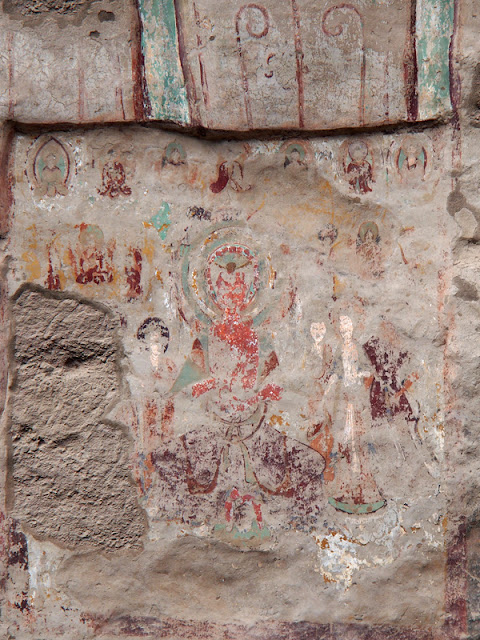 普賢菩薩は微笑んでいるのかな🙂 周囲の壁画は後世の補修のよう。