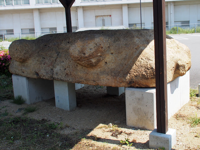 駐車場からお寺に向かうとまず昔の墓地があり、その中に存在感のある石塊はすぐに目に付いた。縄掛け突起もあるのだが、作りかけなのか、これでは縄は掛からないだろう。その上長手の左右の突起は位置がずれているし👀